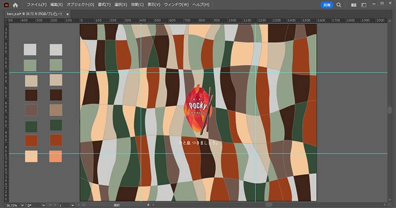 背景のラインはillustratorのペンツールで描き、パスファインダーで分割、合体などの処理をしてマス目に。そこに色をつけている。