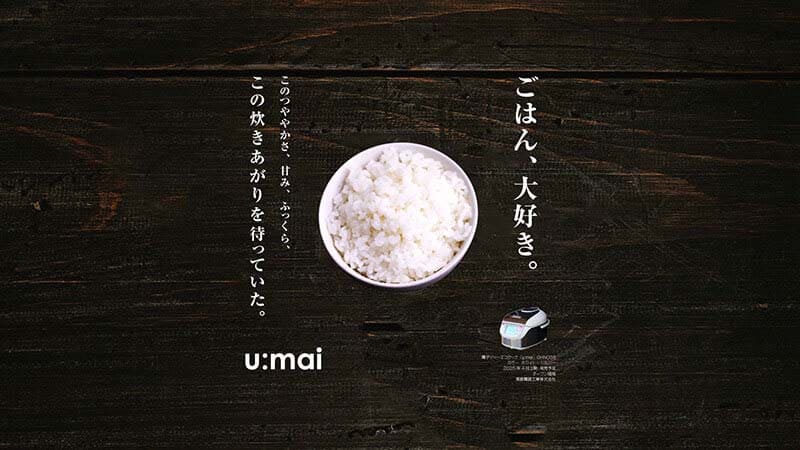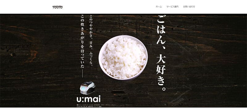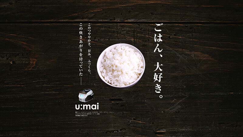 前述した通り、クライアントは商品そのものよりもご飯の炊き上がりを強調することを望んでいた。そのため、商品(炊飯器)の画像は思い切って小さくしている。これはあくまでも商品紹介サイトのヒーローイメージであり、商品説明の写真はサイト内の別の場所に掲載されることを想定したうえでこのようにデザインした。